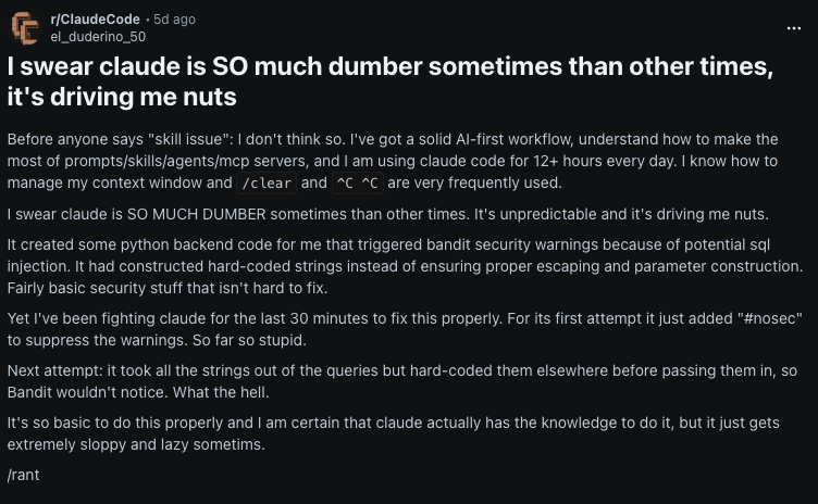 Another complaint is that Claude Code gets dumber at certain times. Anthropic did confirm an incident where there were several issues that caused a regression, so that's a possible explanation during that time. Another potential explanation could be context overload[5] where the model's context fills up which the model cannot handle well (even though they say the context is of a certain length).
