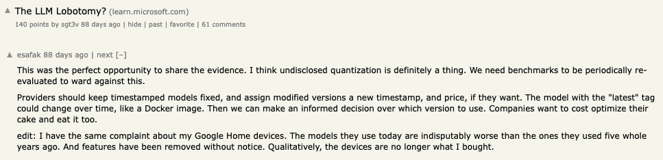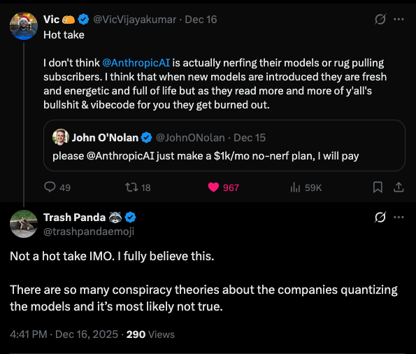 Sentiment around AI companies is sour. They promised a lot of bullshit and it's a bad look. But I don't think they're trying to screw over Joe Schmoe by rug-pulling model quality. The idea that quantization is their only cost-reduction tool is ridiculous. If it smells like a conspiracy theory and sounds like one, it probably is.