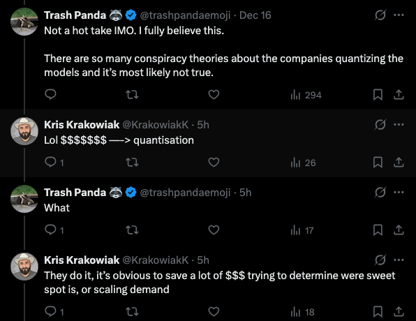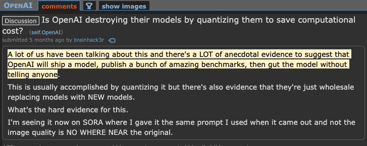The general sentiment around AI companies has been prety sour. I get it, they promised a lot of bullshit and its a really bad look. However, I don't think they're trying to screw over Joe Schmoe by rug pulling them with a dumber model after release. I also specifically think that this idea that these companies are using quantization as the only tool in their belt to reduce GPU usage is ridiculous. If it smells like a conspiracy theory, sounds like a conspiracy theory, then it probably is a conspiracy theory.